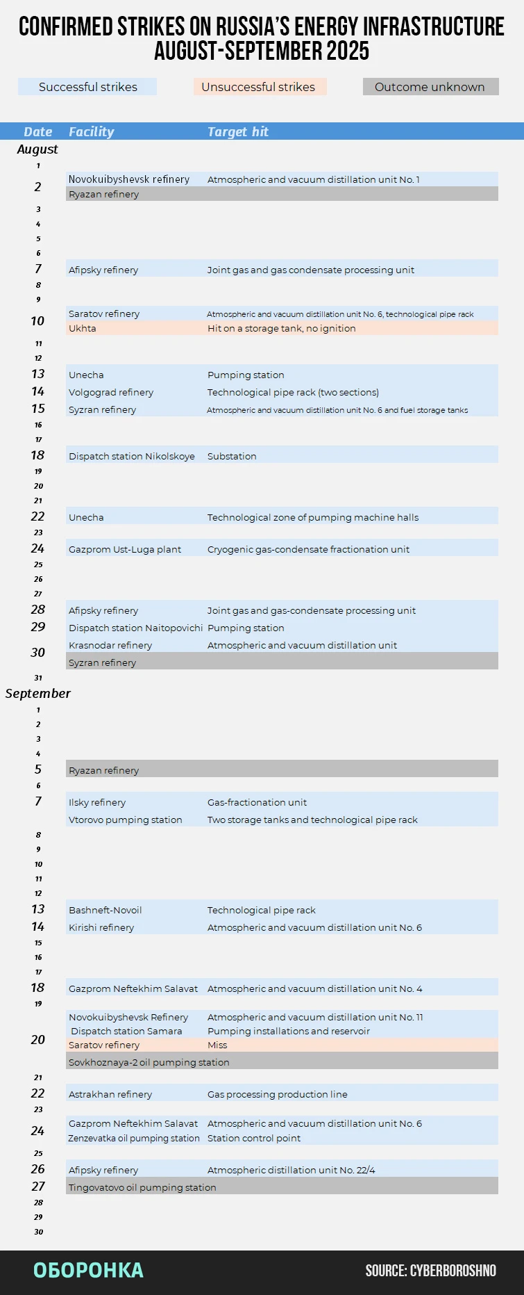 Như tờ Ekonomichna Pravda đã giải thích , các cuộc tấn công của Ukraine vào các nhà máy lọc dầu diễn ra đúng vào mùa tiêu thụ nhiên liệu cao điểm. Rõ ràng lực lượng phòng vệ đã chọn đúng thời điểm để tiến hành chiến dịch.